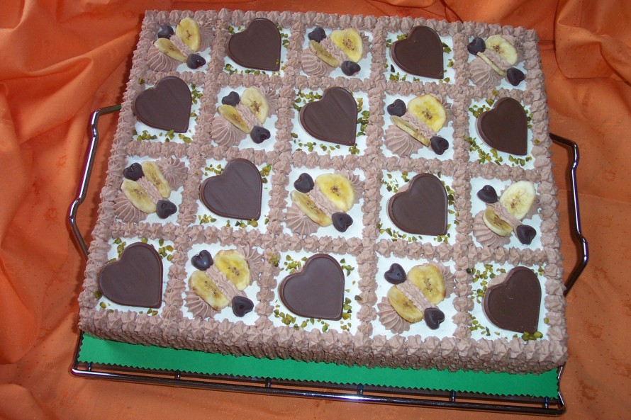 Schlagsahne + Schokoladensahne, Bananenchips, Schokoladenherzchen,