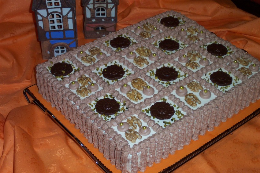 Schlagsahne + Schokoladensahne, Walnüsse, goldenen Zuckerkugeln,