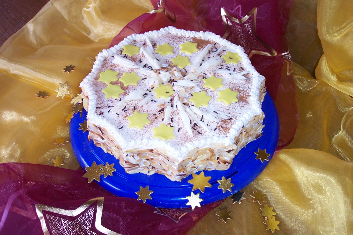 gelben Sternen aus Marzipan verzieren.