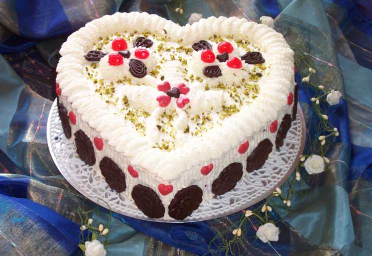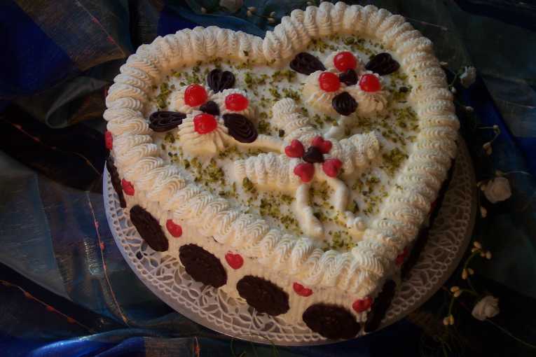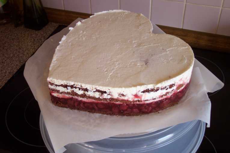 Für die Garnitur habe ich aus Kuvertüre rote Herzen, Ornamente