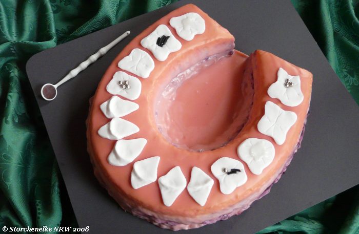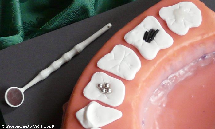 Karies und Plomben sind aus Lakritze und silbernen Zuckerperlen gefetigt.