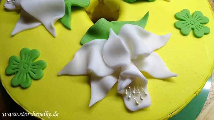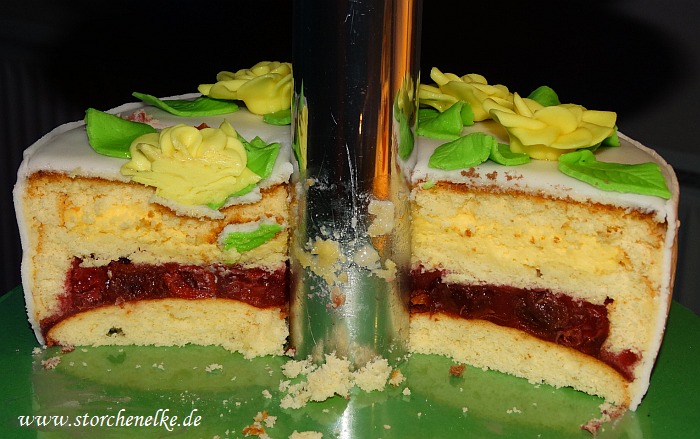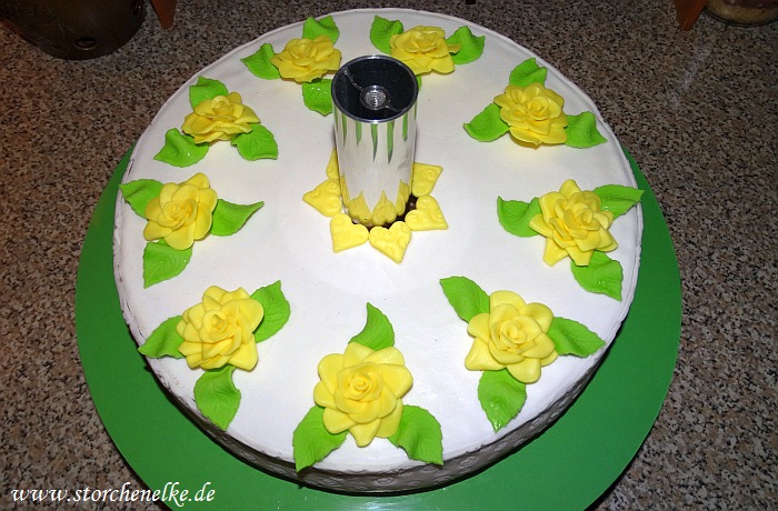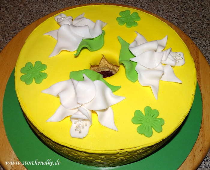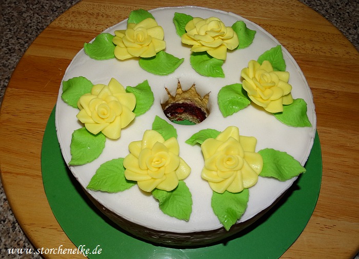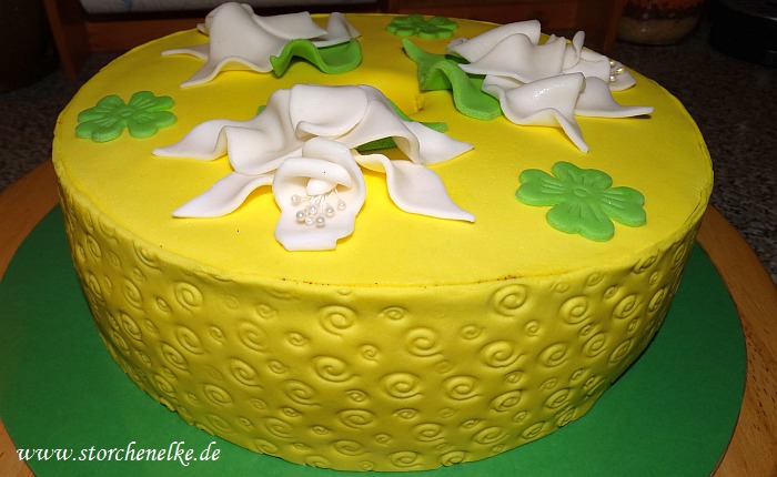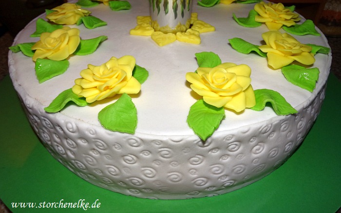 Die Torte habe ich komplett mit selbstgemachem Fondant ummantelt + dekoriert!