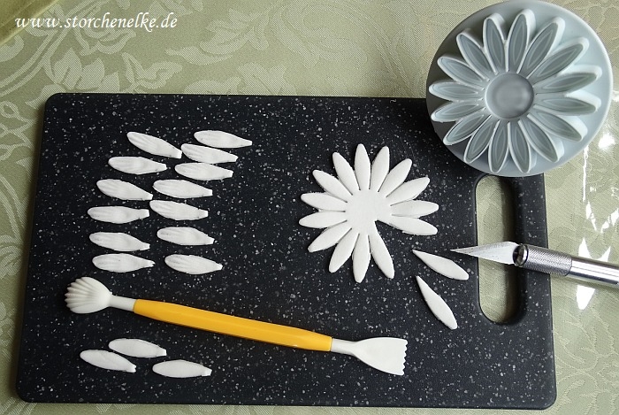 Ich habe zuerst die Flügelform aus ganz dünnen Fondant ausgeschnitten.