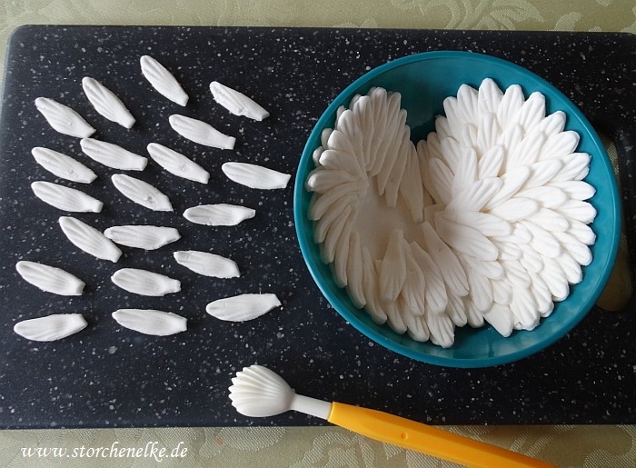 Für die Flügel habe ich einzelne Federn aus insgesamt 9 Gerbera-Blüten