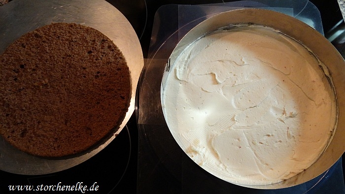 Nach dem Backen in einer runden Form, habe ich den Biskuit gefüllt und erst mal