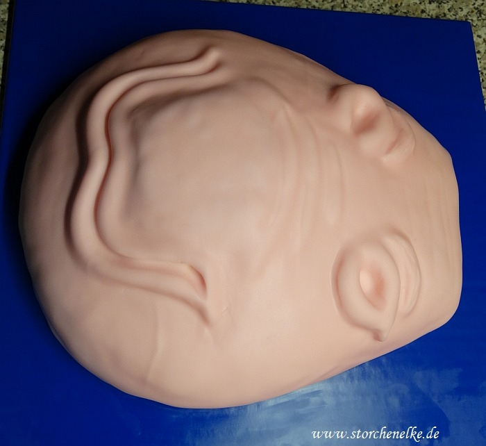 Danach den Kopf komplett mit einer Lage rosa Fondant (500 g) abdecken