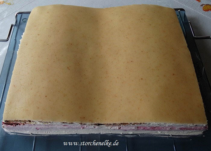 eine Marzipandecke aufgelegt und den Rand mit Bittercreme gespritzt.