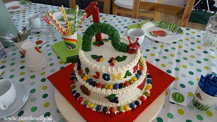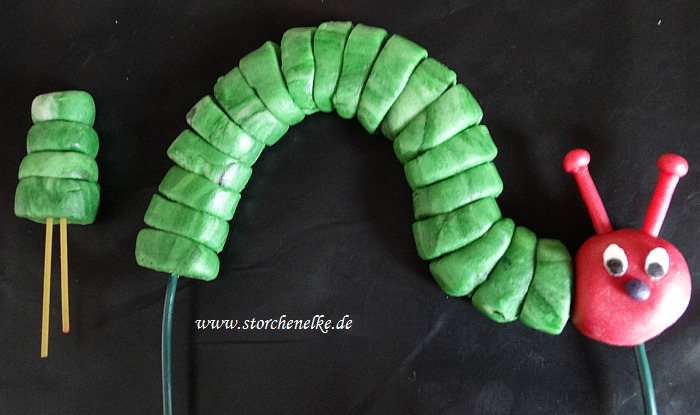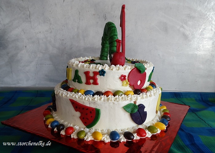 Die Dekoration mit der *Raupe Nimmersatt* habe ich aus Marzipan gefertigt.