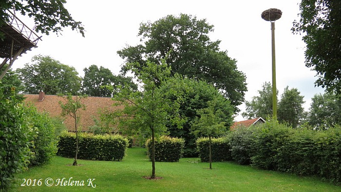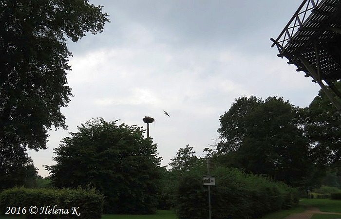 Das Storchennest befindet sich auf einem Mast im Gartengelände | ||||||||||||||||