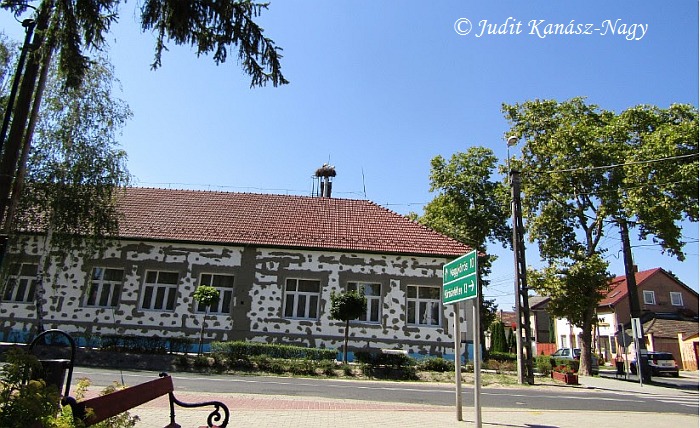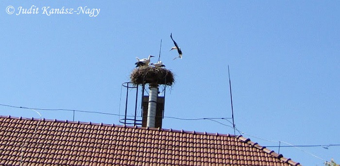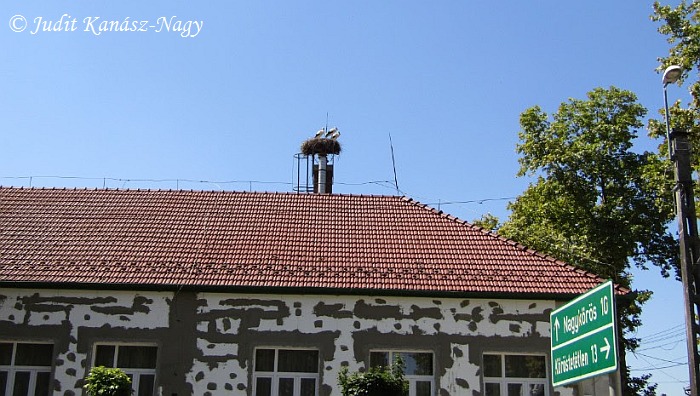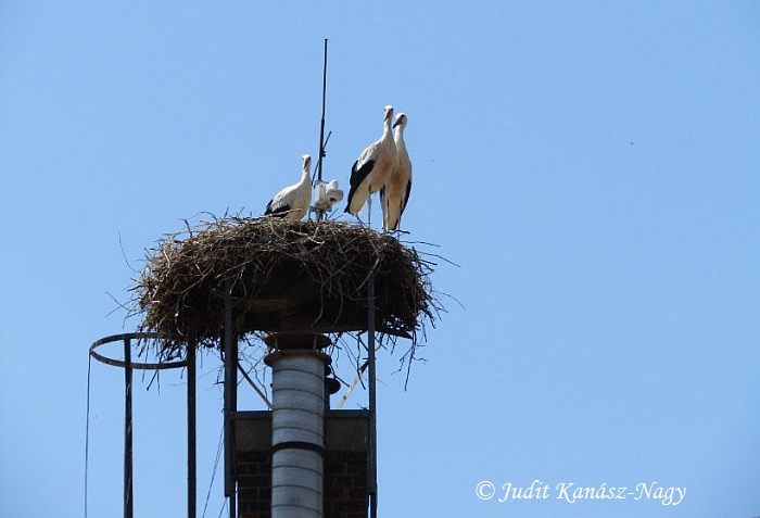Störche brüten seid 2000 auf dem Schornstein der Grundschule in Kocsér.