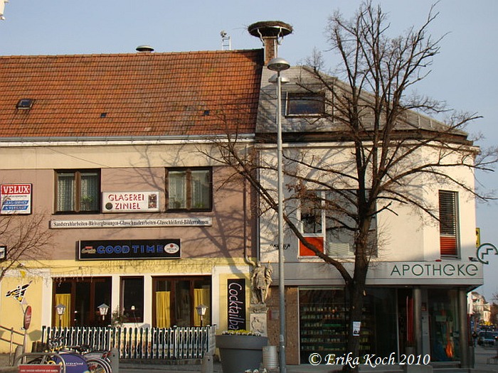 Das Storchennest befindet sich auf dem Dach der Kreisapotheke, | ||||||||||||||||