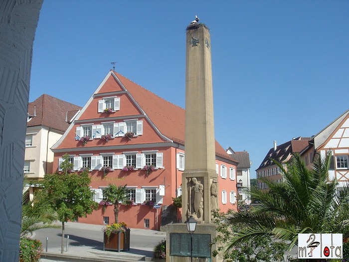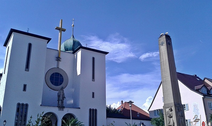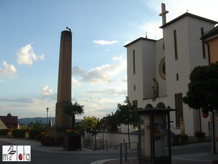 Das Storchennest befindet sich auf dem Obelisken (Kriegsdenkmal), vor der | ||||||||||||||||